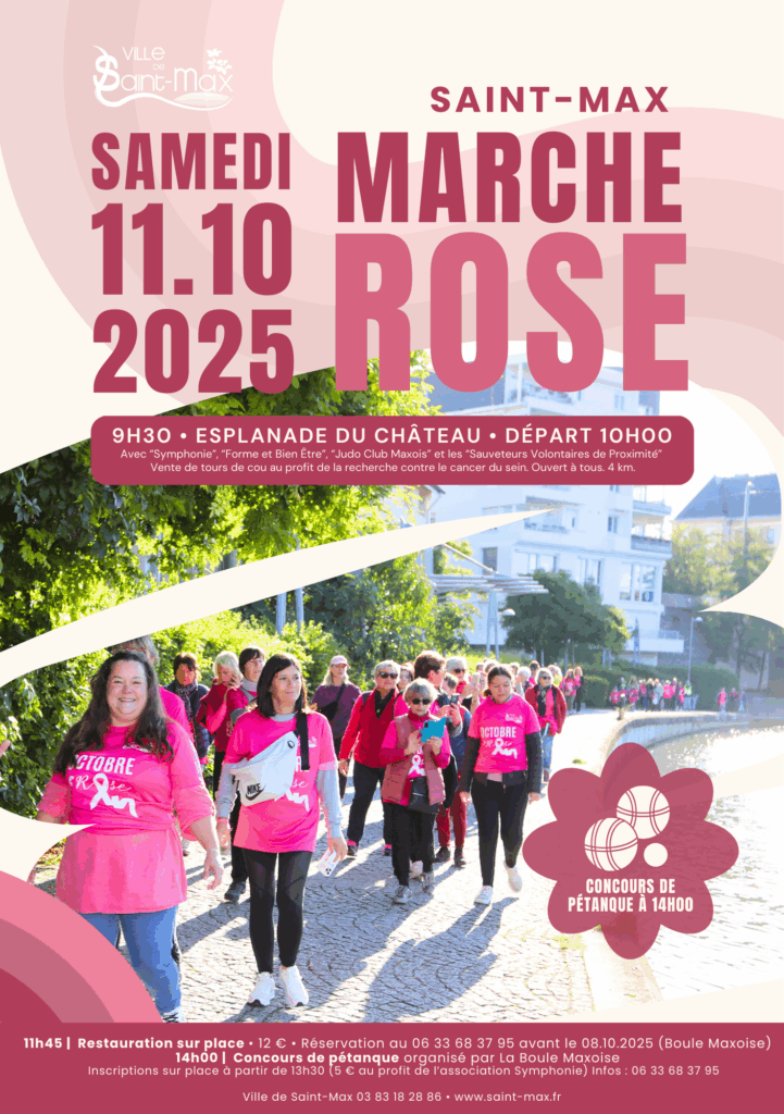 La Ville de Saint-Max vous donne rendez-vous le samedi 11 octobre 2025 pour la traditionnelle Marche Rose, organisée dans le cadre de la lutte contre le cancer du sein.