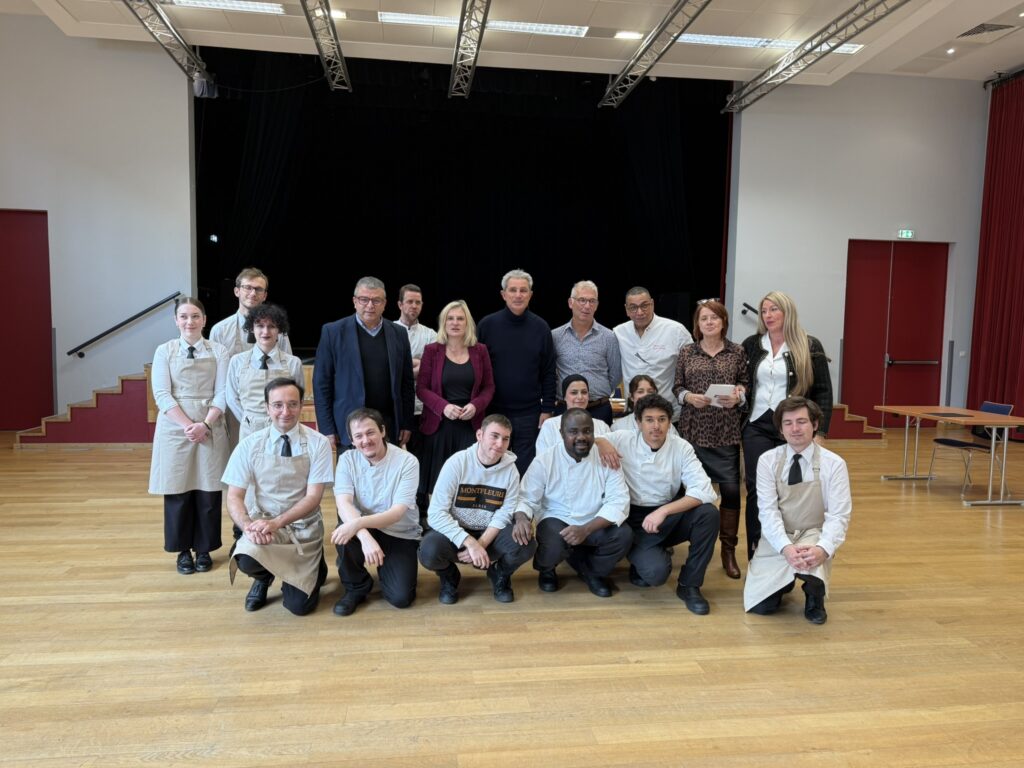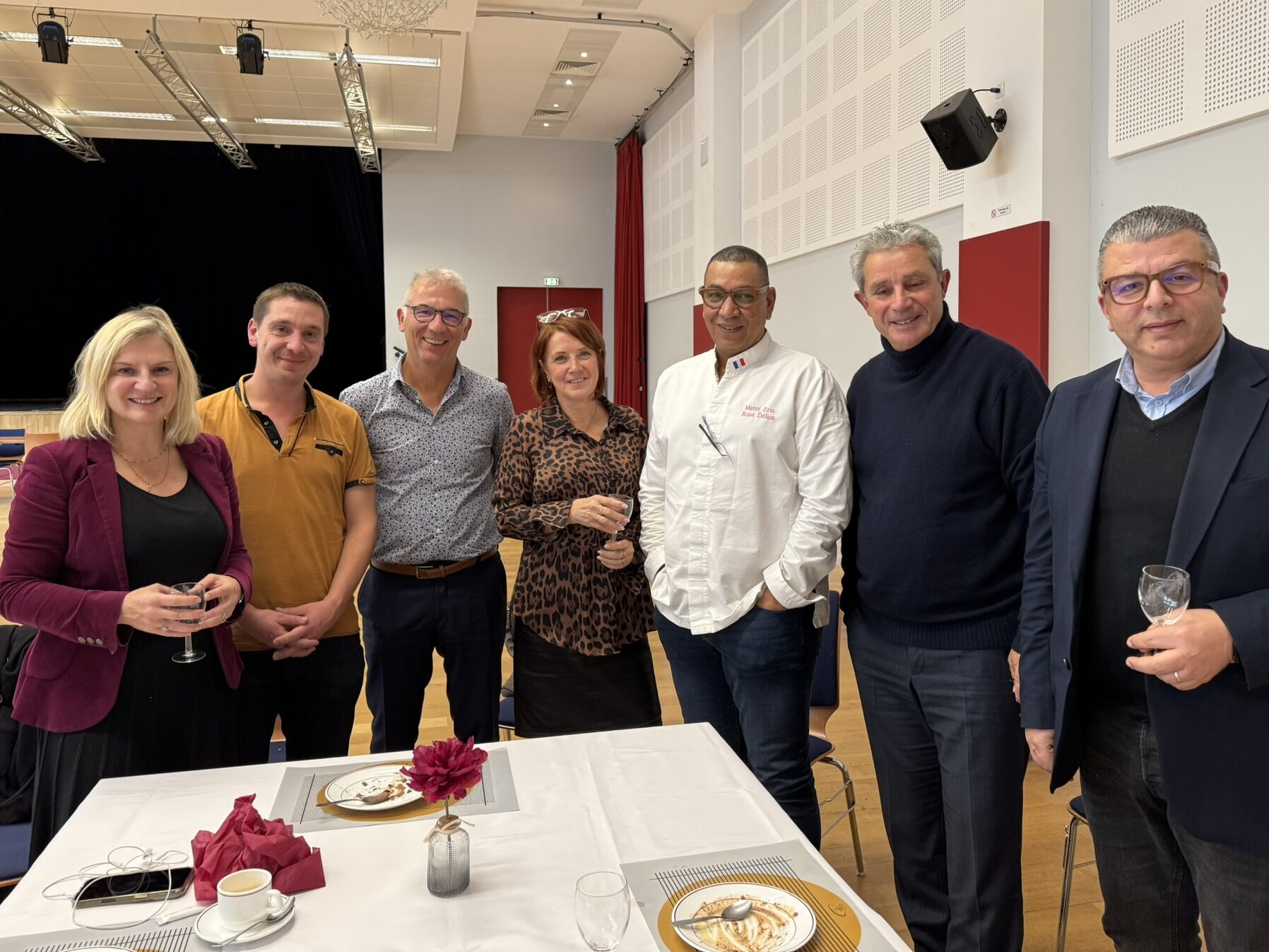 Valérie Debord, Vice-Présidente de la Région Grand Est, Thomas Henry, Responsable Location de Salles, Pascal Bauzin, Formation Bauzin, Christine Hinsinger, Adjointe aux Seniors, Chef Eric Mette, Eric Pensalfini, Maire de Saint-Max et Kader Dali, responsable Pôle Seniors