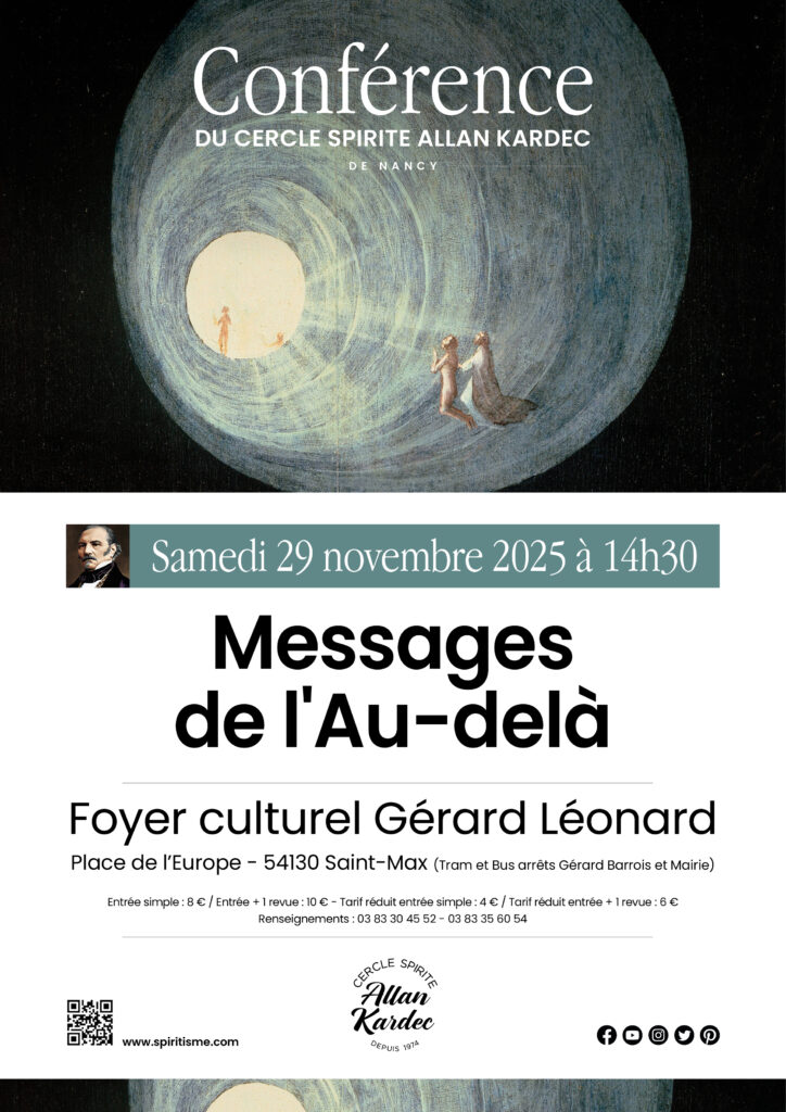 Les spirites se font alors les interprètes de ces messages reçus en séances spirites, afin de démystifier le Spiritisme et d’offrir des repères à un public toujours plus nombreux en quête de sens. Un débat suivra l’exposé où chacun pourra poser toute question en rapport avec le sujet et la philosophie spirite.