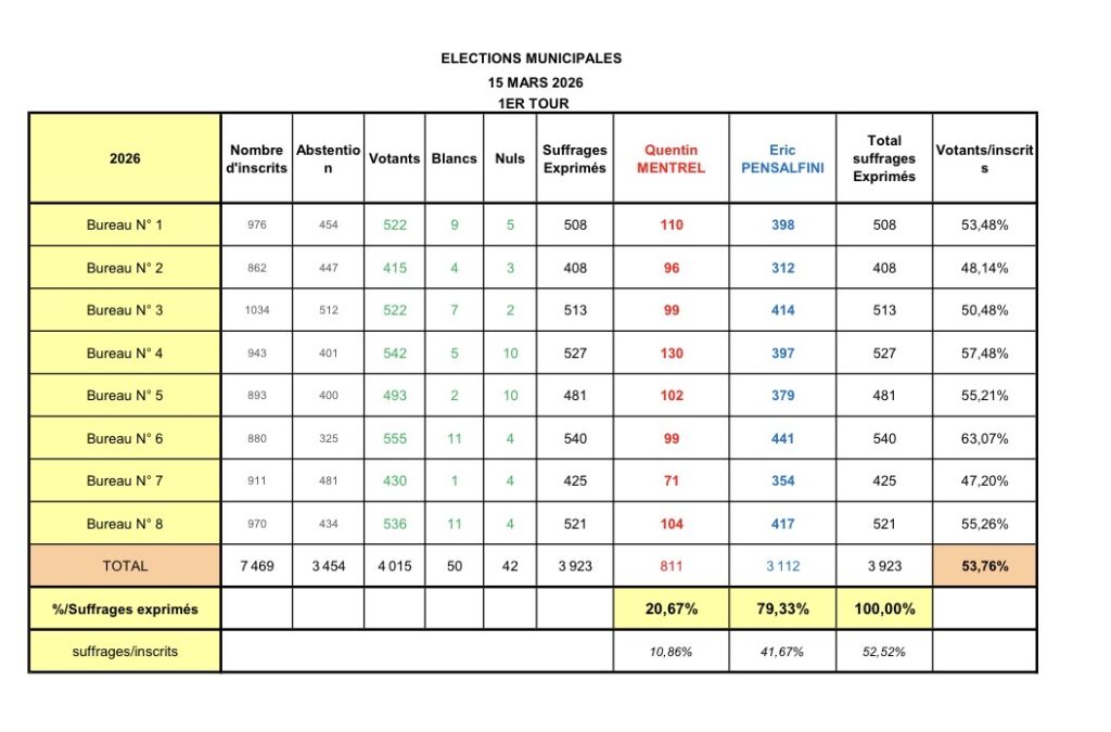 • Éric Pensalfini obtient 3 112 voix, soit 79,33 % des suffrages exprimés.