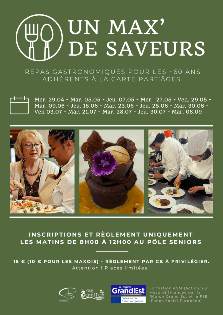 Un Max’ de saveursRepas gastronomiques pour les + de 60 ans adhérents de la Carte Part’âges au tarif de 15 € le repas (10 € pour les Maxois).